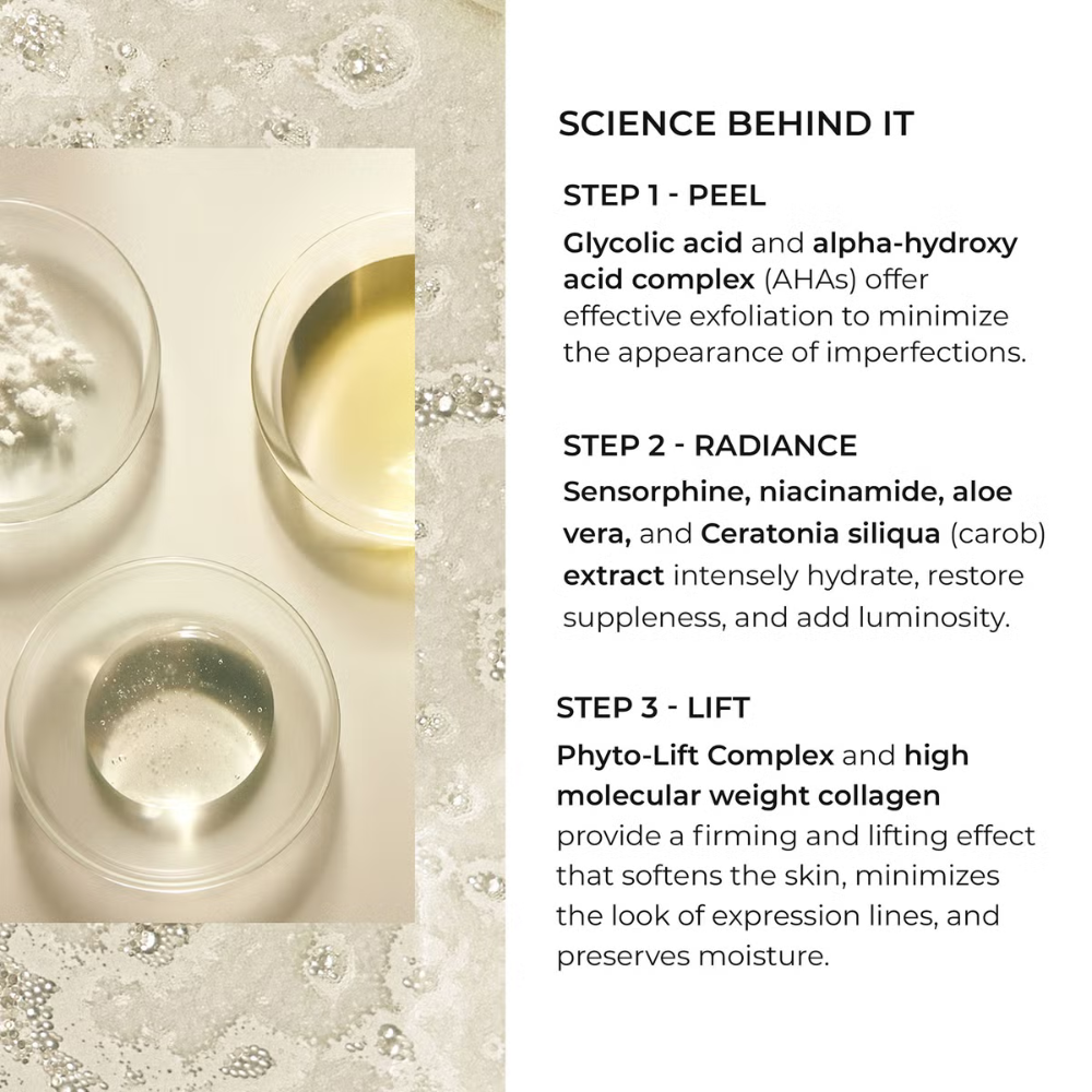 LIFT — hüdrolüüsitud sojavalk, lahustuv kollageen, kaera- ja edelweissi ekstrakt kohese pinguldava efekti saavutamiseks